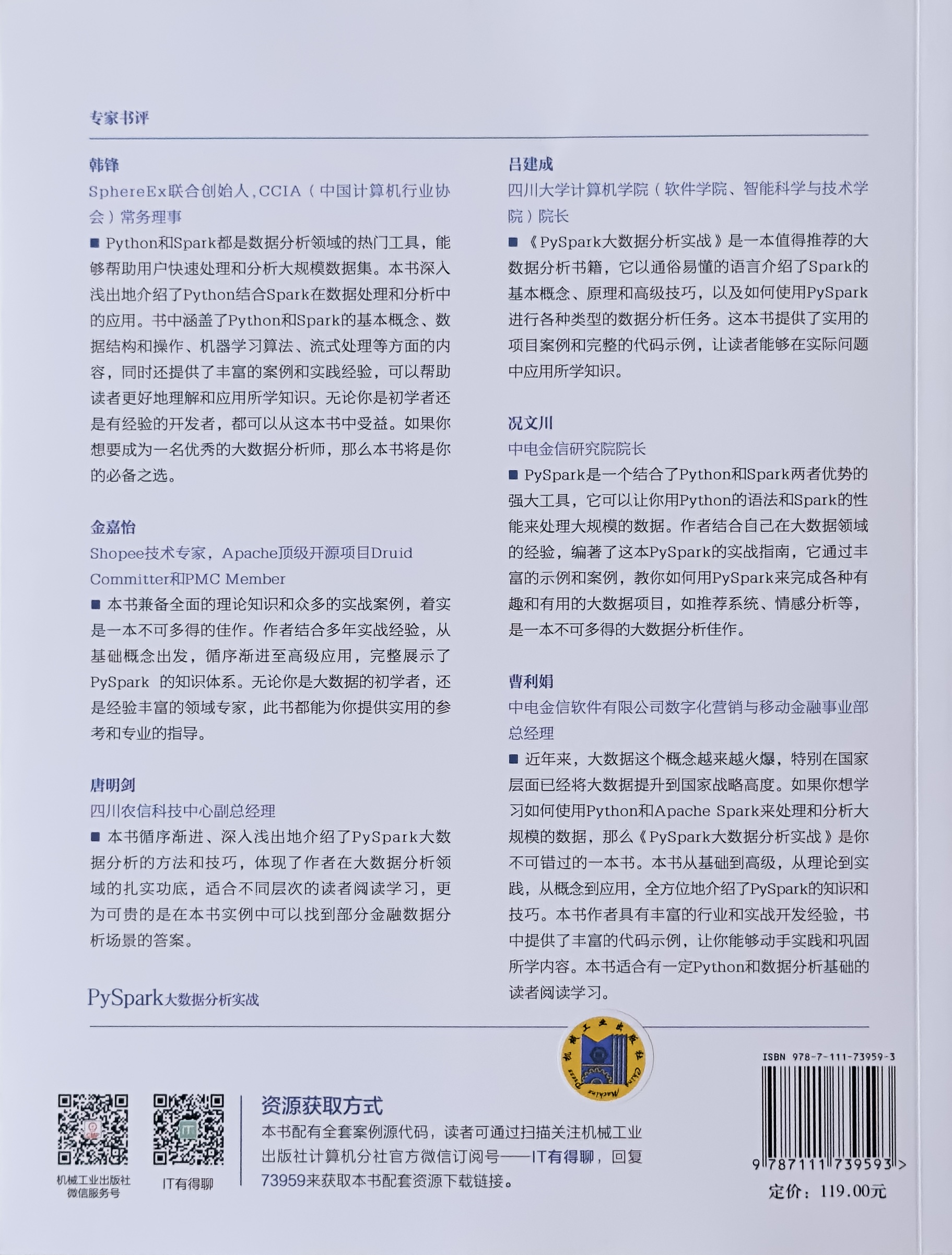 感谢张主任的赠书,预祝新书大卖 发表于 2023-12-17 分类于 书籍 阅读次数: 本文字数: 208 阅读时长 ≈ 1 分钟 《PySpark 大数据分析实战》兼备全面的理论知识,更具众多的实战案例,着实是一本不可多得的佳作。作者结合多年实战经验,从基础概念出发,循序渐进至高级应用,完整展示了 PySpark 的知识体系。无论你是大数据的初学者,还是经验丰富的领域专家,此书都能为你提供实用的参考和专业的指导。 欢迎加入我们的技术群,一起交流学习 群名称 群号 人工智能(高级) 人工智能(进阶) 大数据 算法 数据库 Apache Druid 钉钉群 23318065
