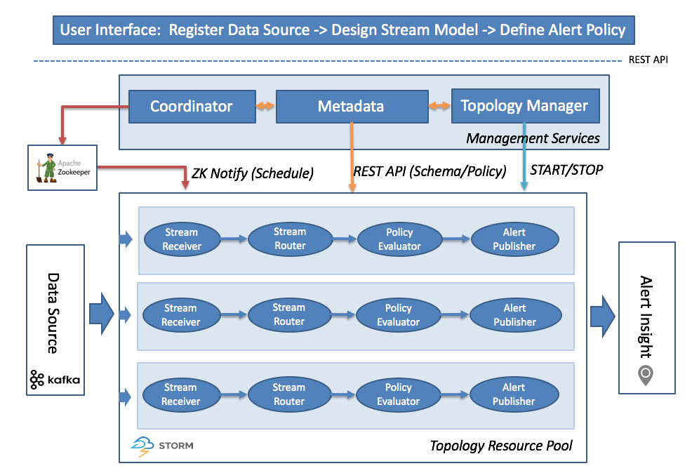 数据实时处理 流处理 API Eagle Alert Engine 是基于开源实时流处理框架的,如 Apache Storm 作为默认执行引擎,Apache Kafka 作为默认的消息总线(Messaging Bus)