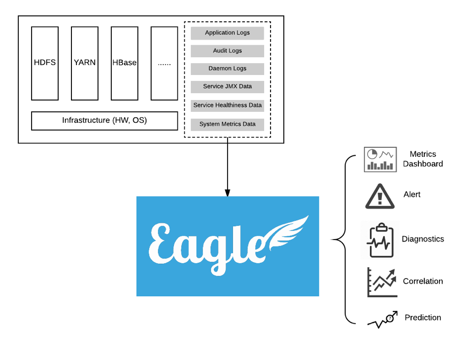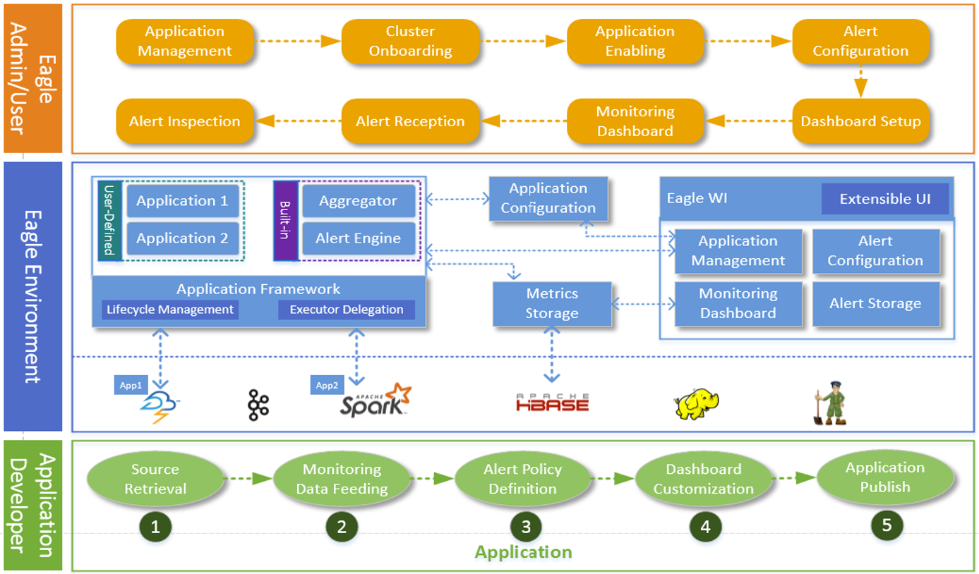优缺点 优点 高拓展性 Apache Eagle 围绕 application 概念构建了其核心框架,application 本身包括用于监视源数据收集,预处理和归一化的逻辑。开发人员可以使用 Eagle 的应用程序框架轻松开发自己的开箱(out-of-box)监控应用程序,并部署到 Eagle 中
