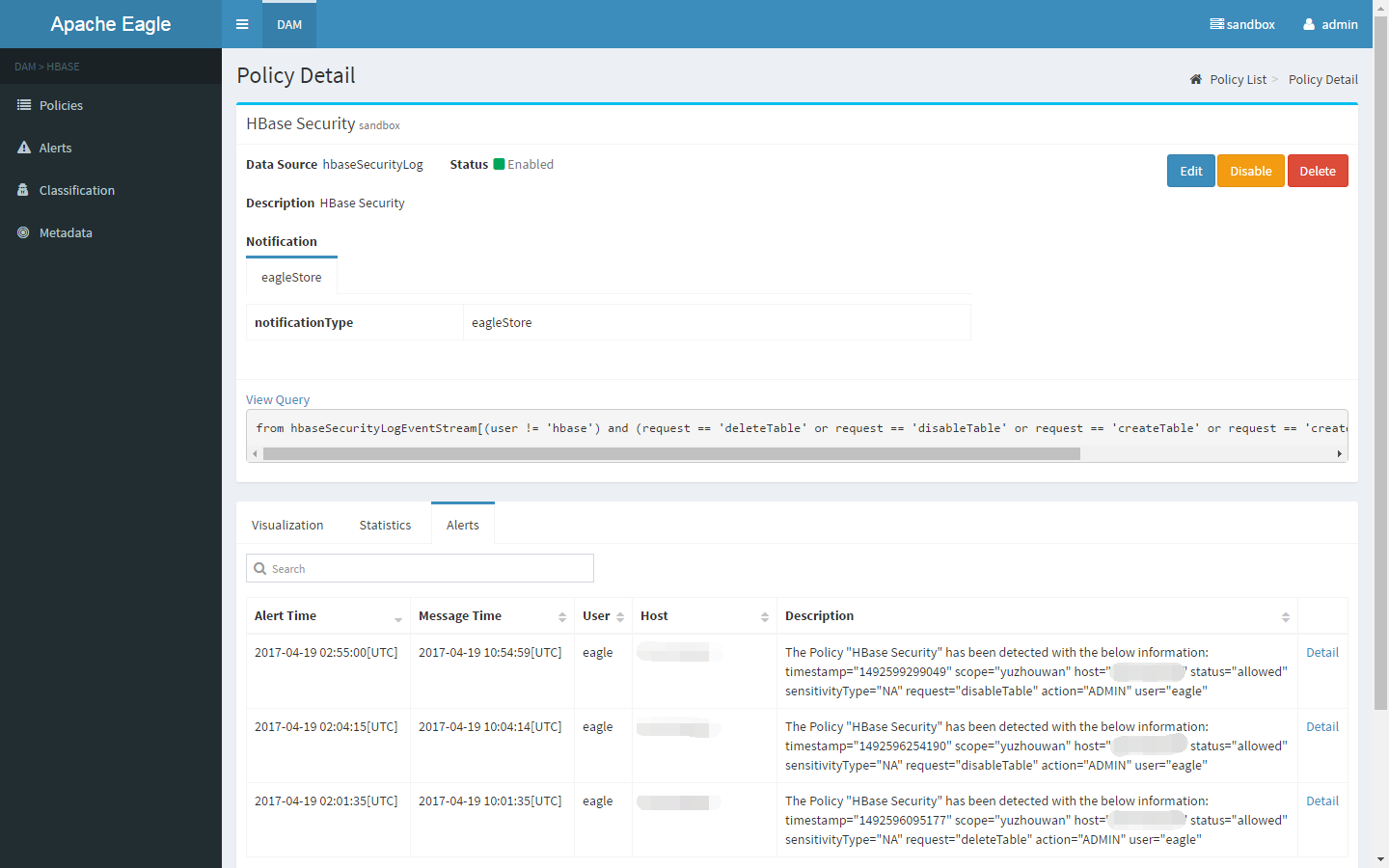 配置告警 在 Site 中配置好 HBase 的 hbaseSecurityLog application 之后,可以在 Data Classification 中看到如下界面 之后,新建 Policy